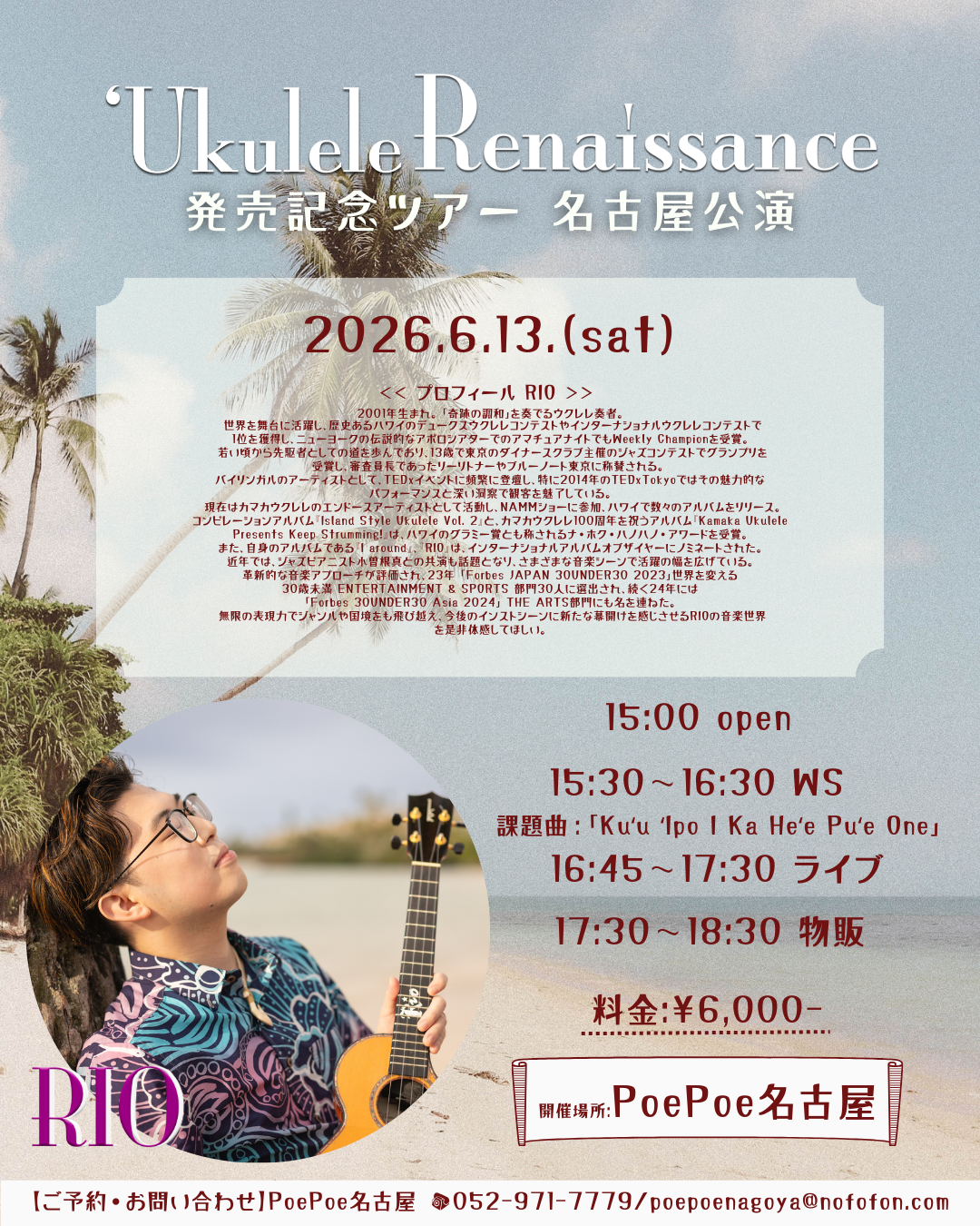 アルバム「’Ukulele Renaissance」発売を記念してPoePoe名古屋に登場。